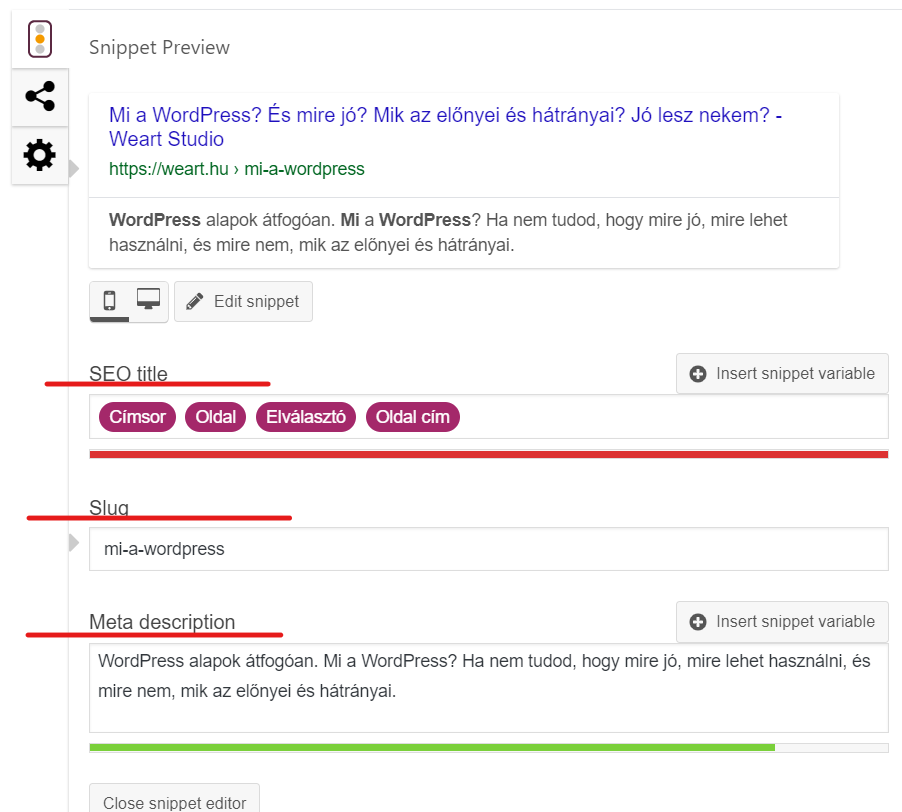 A Yoast SEO lehetővé teszi, hogy minden blogbejegyzéshez külön SEO címet, leírást és kókusz kulcsszót ad, valamint megmutatja, hogy hogy fog kinézni a keresőben a találat.