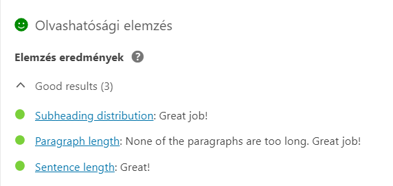 Mindenképpen fordíts kiemelt figyelmet az olvashatósági elemzés fülre. Itt ajánlásokat fogsz látni arról, hogy hogyan tedd még jobban keresőoptimalizálttá a bejegyzésedet.